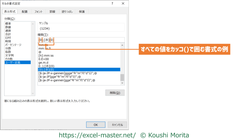 ちなみに、「カッコ()で囲む書式」とは、「(0);[赤](0)」のように表示形式のユーザー定義でカッコ()で正の値またはすべての値を囲っているものです。
