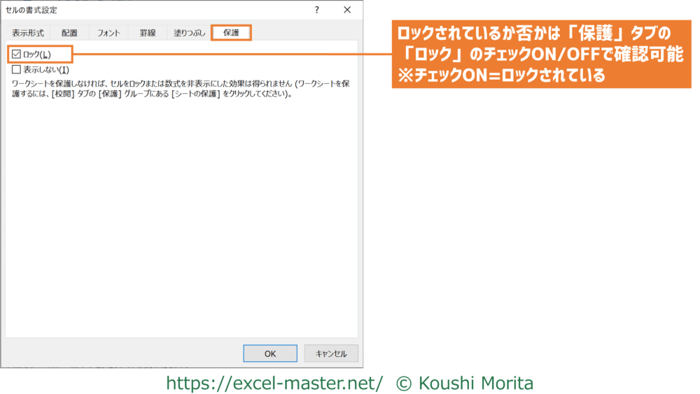 セルがロックされているか否かは、「セルの書式設定」ダイアログの「保護」タブの「ロック」のチェックがON/OFFで確認できます(チェックON=ロックされている)。