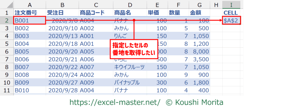 CELLを使うことで、指定したセルから任意の情報を取得できます。