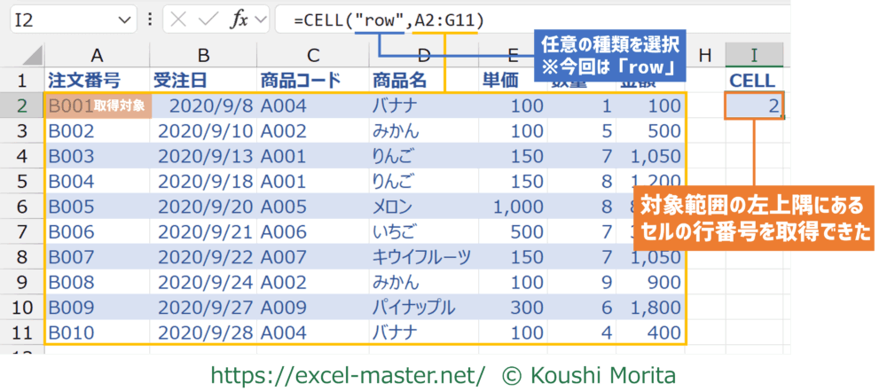 引数「検査の種類」に「row」を指定した場合、対象範囲の左上隅にあるセルの行番号を表す数値が戻り値となります。