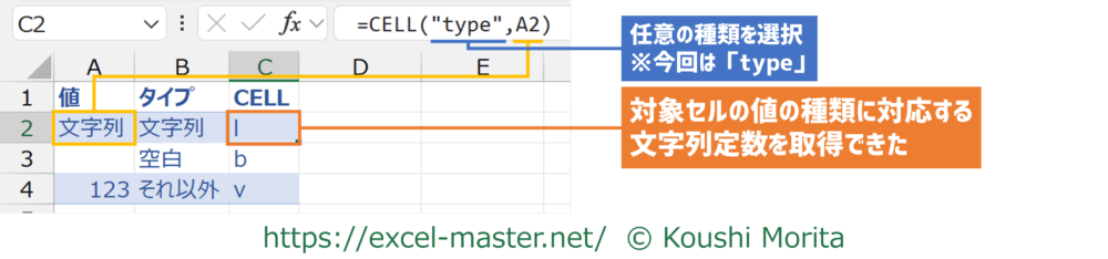 引数「検査の種類」に「type」を指定した場合、対象セルの値の種類に対応する文字列定数が戻り値となります。