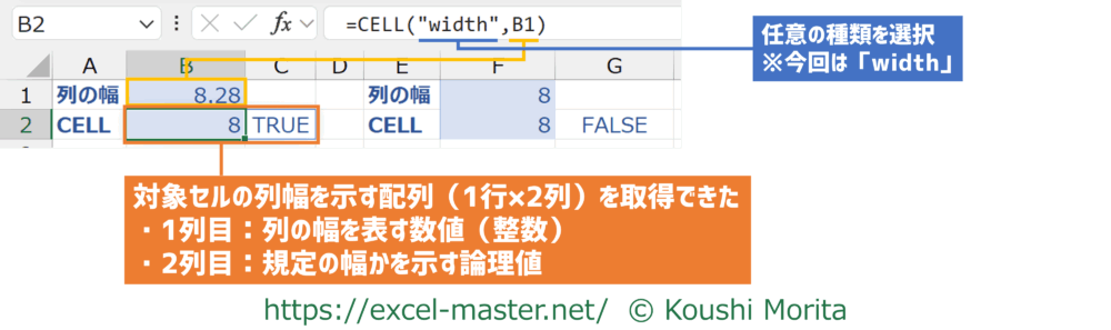 上記では、B1・F1セルをそれぞれ対象にCELLに指定した結果、1列目(B2・F2セル)は両方とも「8」です(B1セルの列の幅「8.28」の小数点以下は四捨五入)。