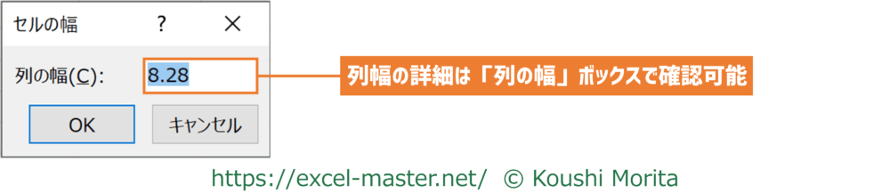 ちなみに、列の幅の詳細は、「列の幅」ダイアログの「列の幅」ボックスで確認できます。