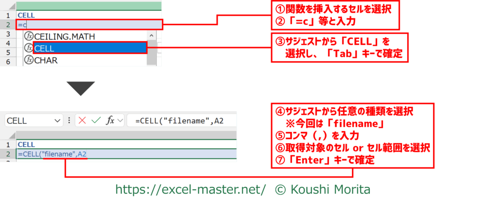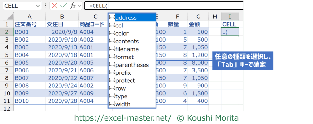 CELLの関数名をセットすると、数式上でサジェストされるため、任意の種類を選択し「Tab」キーで確定しましょう。