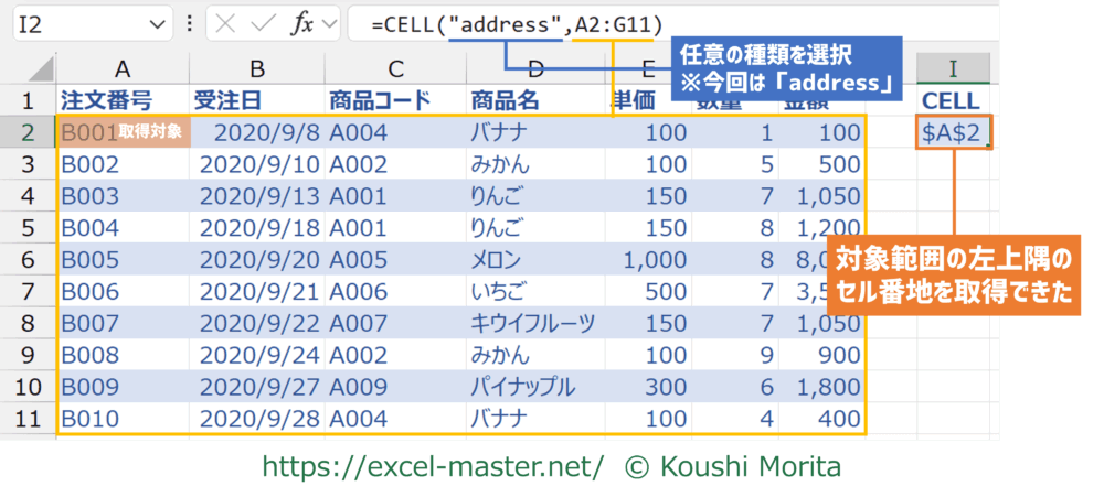 引数「検査の種類」に「address」を指定した場合、対象範囲の左上隅のセル番地を表す文字列が戻り値となります。