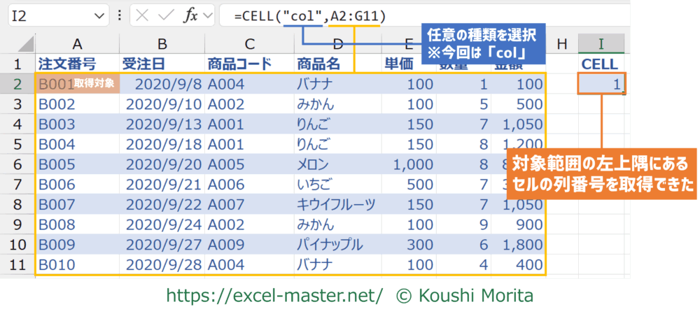 引数「検査の種類」に「col」を指定した場合、対象範囲の左上隅にあるセルの列番号を表す数値が戻り値となります。