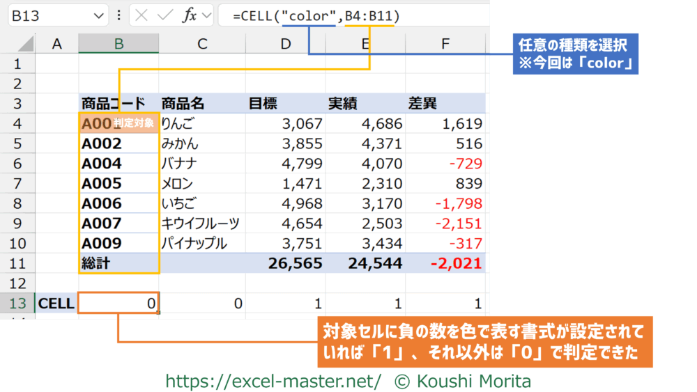 引数「検査の種類」に「color」を指定した場合、対象セルに負の数を色で表す書式が設定されている場合は「1」、それ以外の場合は「0」が戻り値となります。