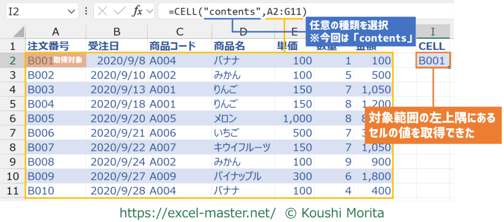引数「検査の種類」に「contents」を指定した場合、対象範囲の左上隅にあるセルの値が戻り値となります。