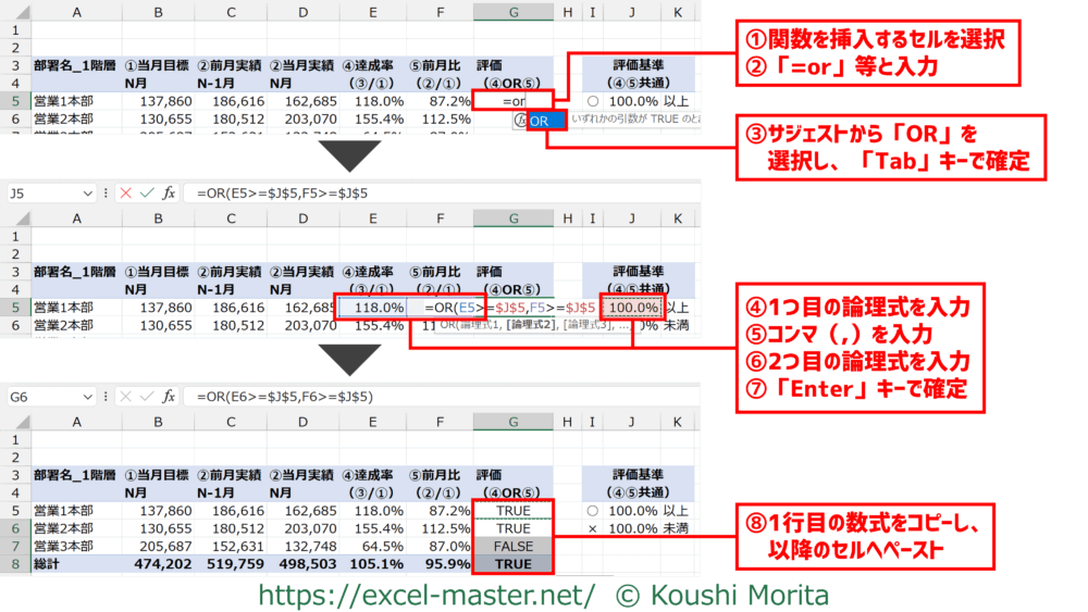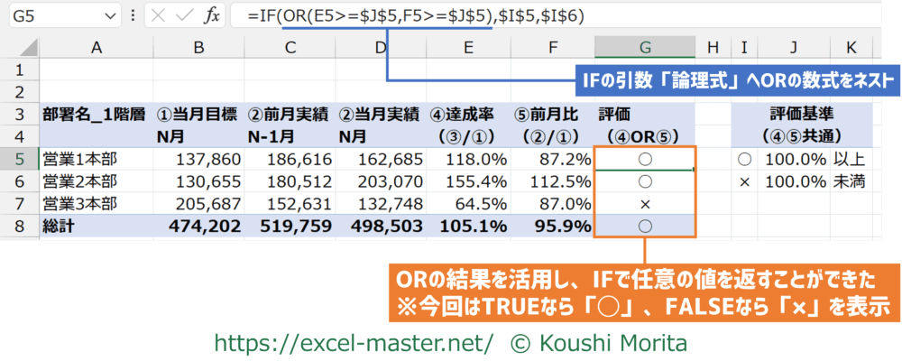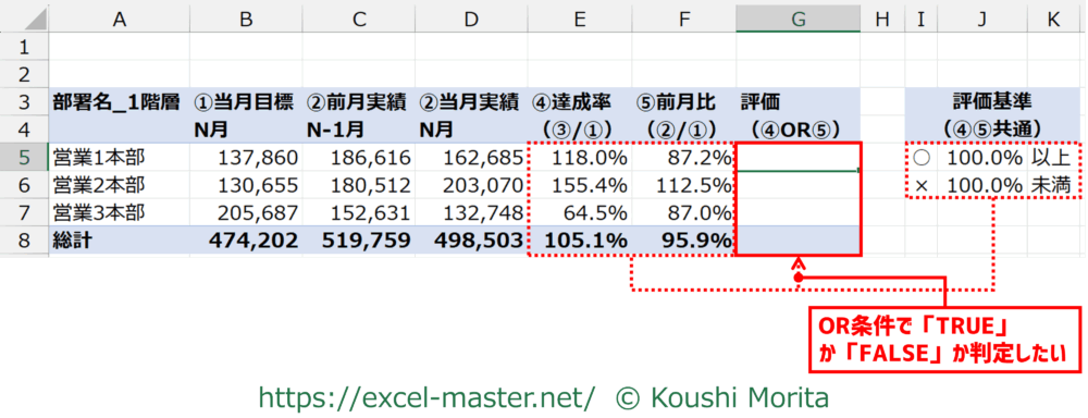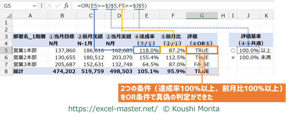 今回は「④達成率」列と「⑤前月比」列を対象に、いずれかが100%以上か否か論理値を返しました。