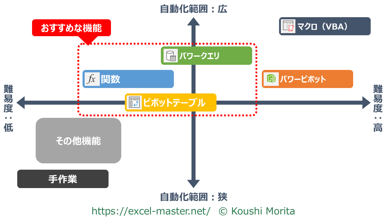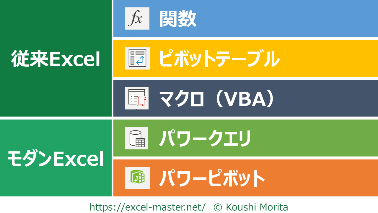 ご覧の通り、従来のExcelは3大機能でしたが、Excel2016以降は「モダンExcel」と呼ばれ、2つの強力な機能が標準搭載され、5大機能になりました。