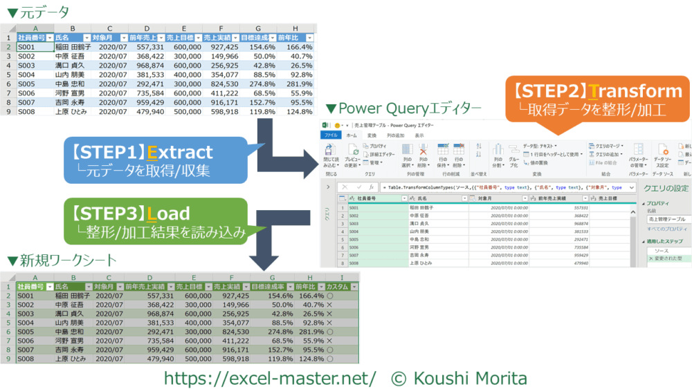 このパワークエリは「ETLツール」と呼ばれており、「ETL」を示す以下3ステップを自動化してくれます。