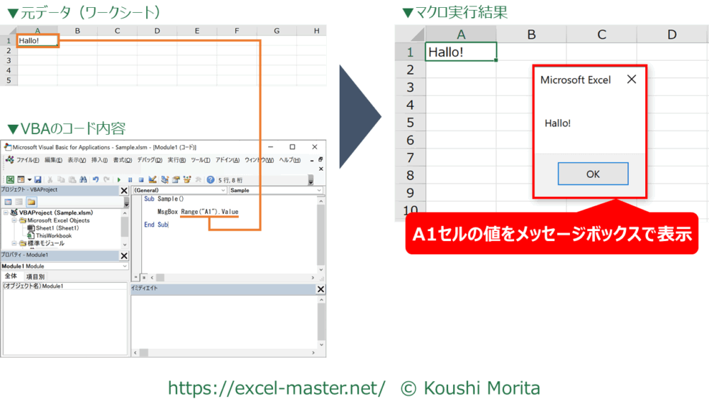 なお、マクロを設定する際、VBA(Visual Basic Application)というプログラミング言語でコーディングが必要です。(以下は簡単な例です)