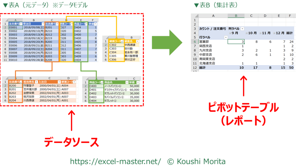 パワーピボットは、このデータモデルを元データにできるため、Excelでビッグデータの集計/分析を行う際に有効です。