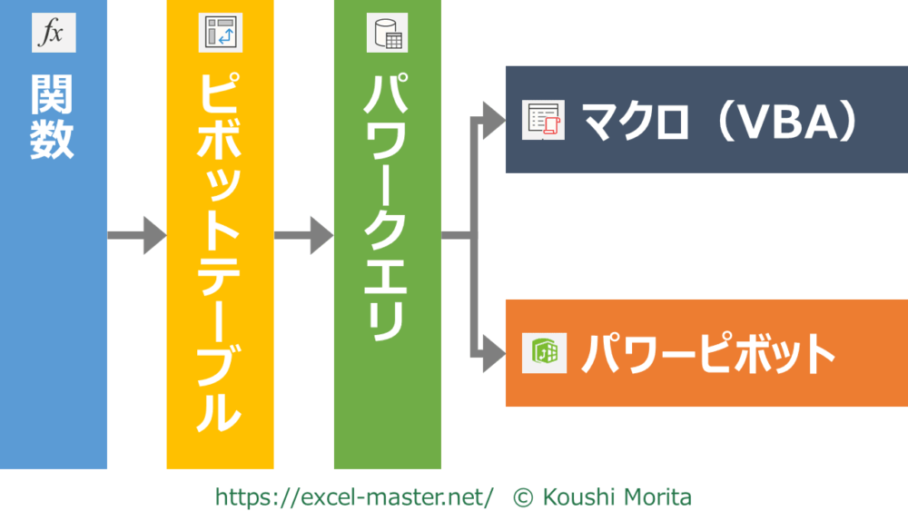 私自身は関数→ピボットテーブル→マクロ(VBA)→パワークエリ+パワーピボットの順に覚えていきました。