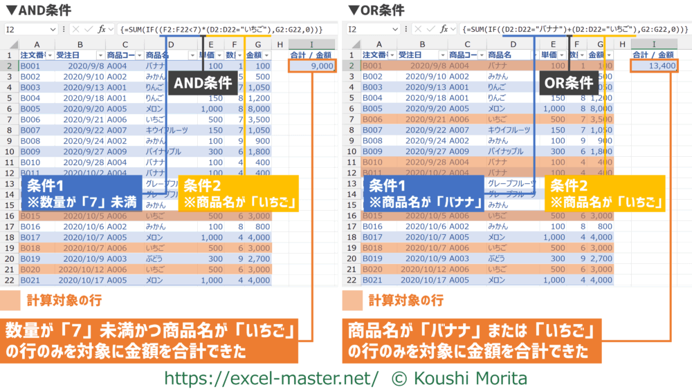 OR条件の場合は「=SUMIFS(G2:G22,D2:D22,”バナナ“)+SUMIFS(G2:G22,D2:D22,”いちご“)」のように複数の数式を加算する必要があるため、配列数式の方がシンプルになるケースもあります。