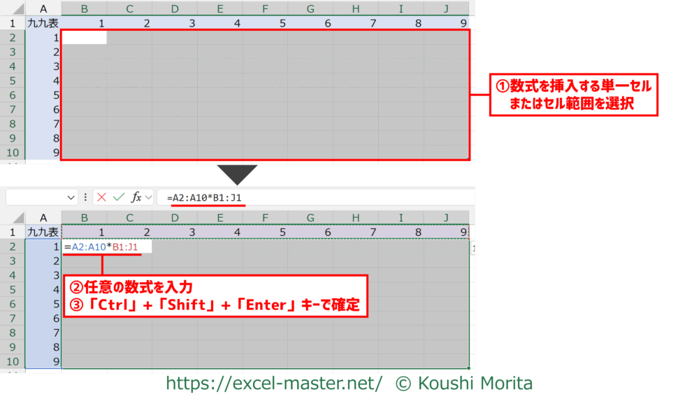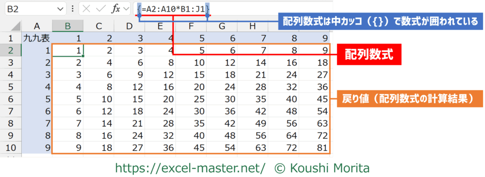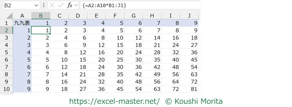 九九表の計算を配列数式でセットしてみましょう。