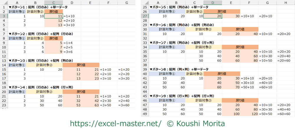 なお、配列同士以外にも、配列に対し単一データを計算させることもできるため、配列数式の組み合わせは計9パターンあります。