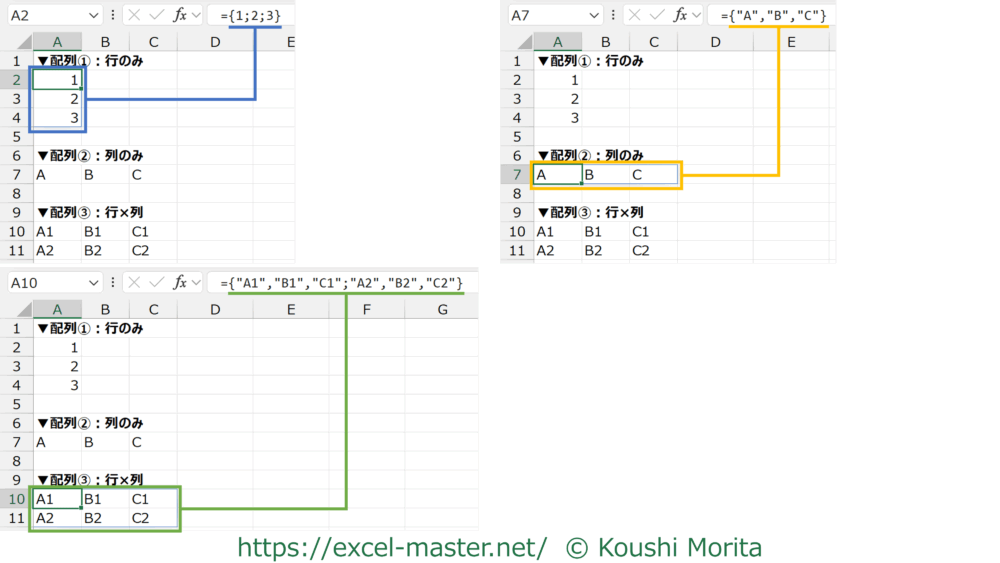 実際にExcel上で配列の3パターン(行のみ、列のみ、行×列)を表現した結果が以下です。