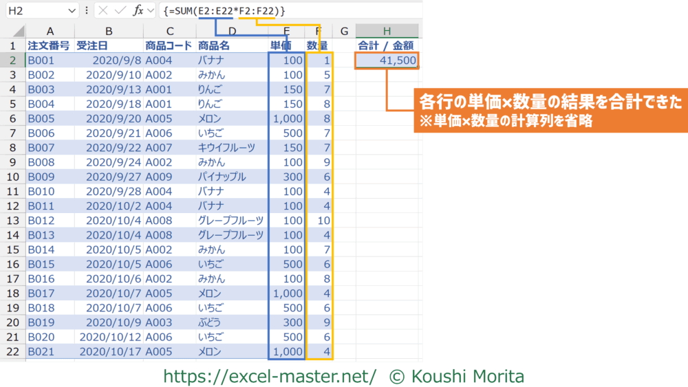 本来は「単価」列×「数量」列を計算した(計算列)をワークシート上に用意した上で、その列をSUMの計算対象にすることが一般的ですが、上記のように配列数式を併用することで計算列を省略することができました。