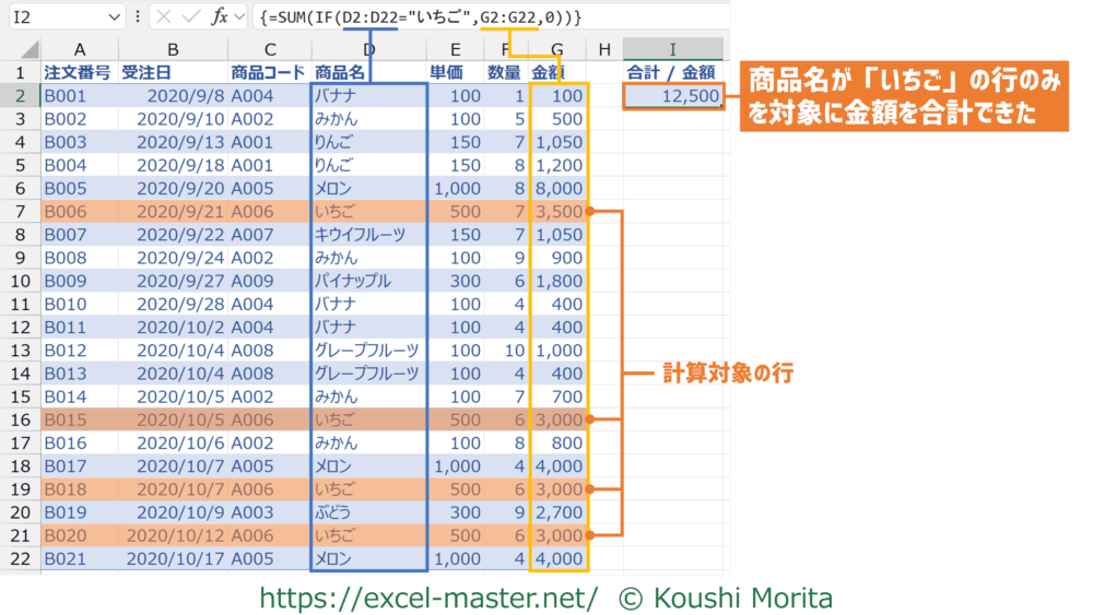 こちらは、IFによってD列(商品名)が「いちご」と等しいか行ごとに判定し、等しい(TRUE)行のG列(金額)のみがSUMの計算対象になります。