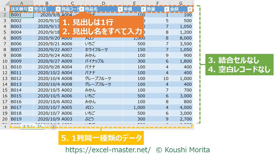 まず、1つ目は元データをピボットテーブルできちんと集計できる表にしておくことです。