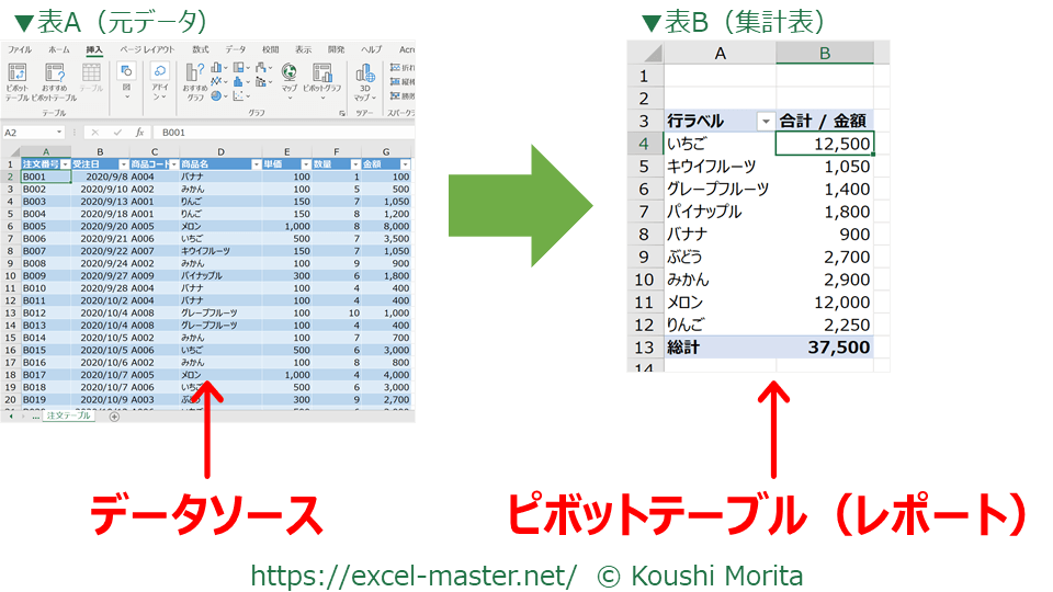 ちなみに、元データとなる表Aのことを「データソース」、集計表となる表Bのことを「ピボットテーブル(レポート)」と呼びます。