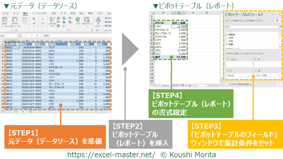 このピボットテーブルですが、大枠のイメージは次の4ステップとなります。