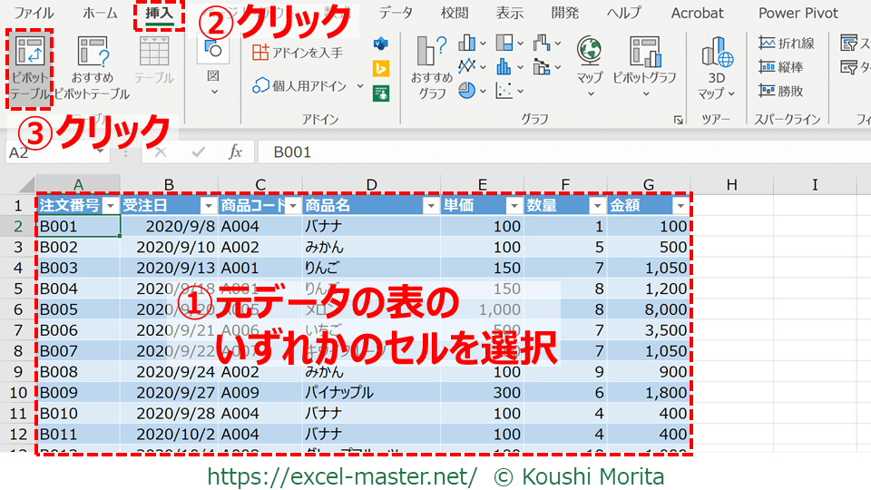 元データの表のいずれかのセルを選択(①)したら、リボン「挿入」タブをクリック(②)し、「ピボットテーブル」をクリック(③)しましょう。