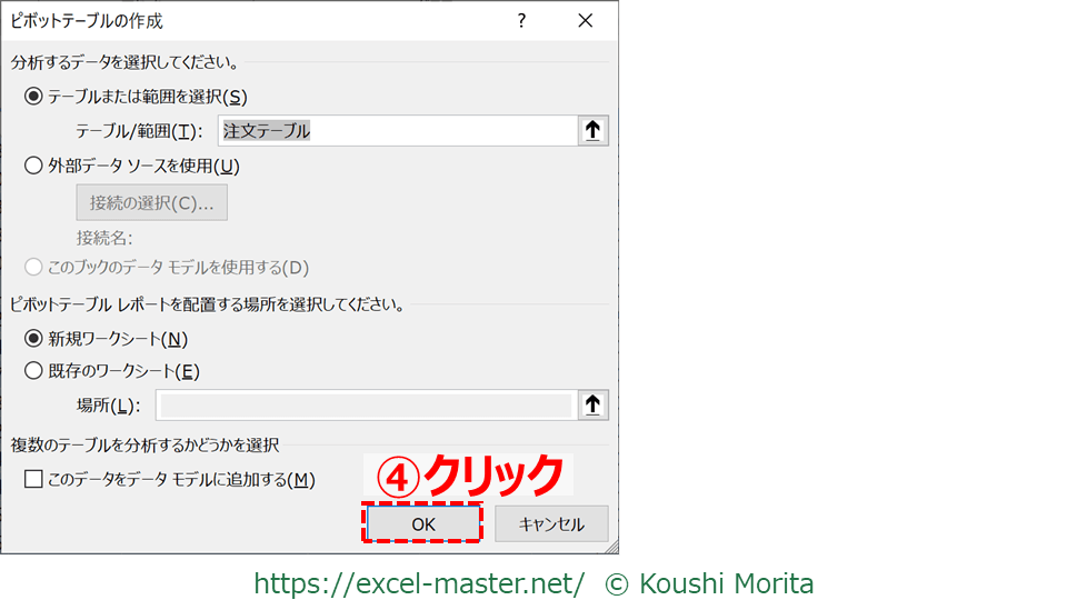 あとは、「OK」をクリック(④)すると、新規ワークシートへピボットテーブルが挿入されます。