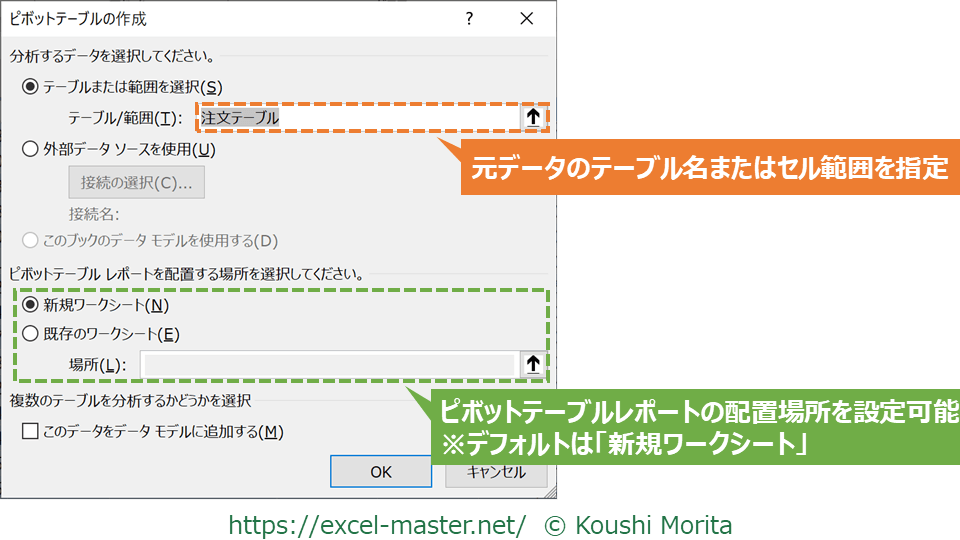 「ピボットテーブルの作成」ダイアログの主な設定項目