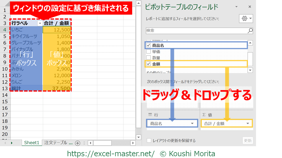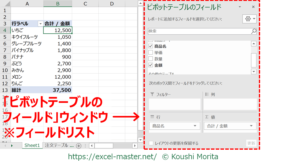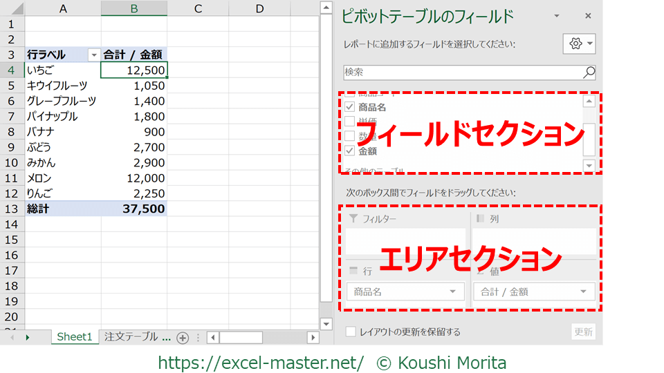 あとは、本記事のSTEP3と同じように「値」ボックスへ「金額」を、「行」ボックスへ「商品名」をドロップして同じ結果になばOKです!