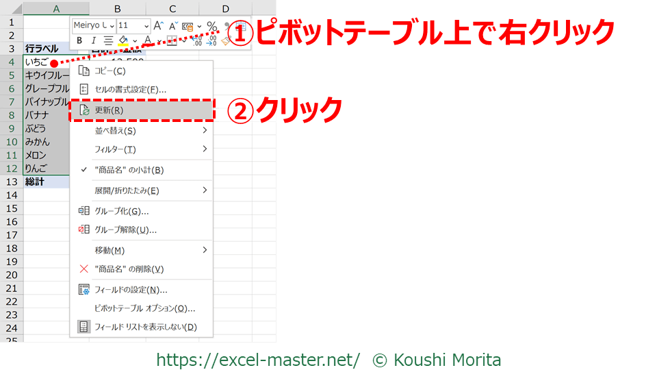 更新する方法ですが、ピボットテーブル上で右クリック(①)し、「更新」をクリック(②)すればOKなので簡単です。