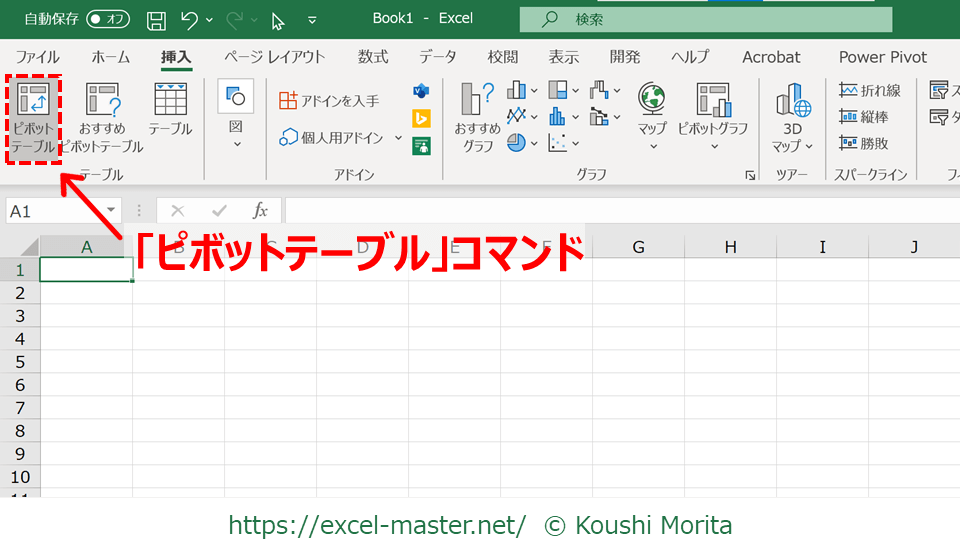 リボン「挿入」タブ上の「ピボットテーブル」コマンドを実行することで、ワークシート上にピボットテーブルを挿入することが可能です。