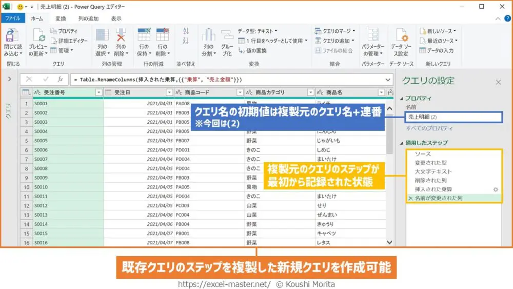 複製元のステップが記録された状態のPower Queryエディターが起動。
