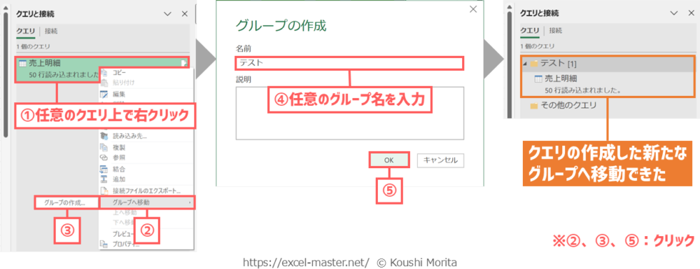 「グループへ移動」とは、任意のクエリを指定のグループへ移動することを指します。