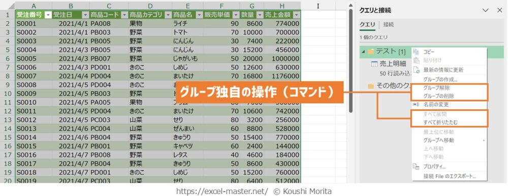 このグループとは、「クエリと接続」ウィンドウ内のフォルダーのようなものです。