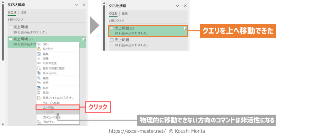 「上へ移動」と「下へ移動」とは、「クエリと接続」ウィンドウ内のクエリが複数ある場合、任意のクエリの位置を上下に移動することを指します。