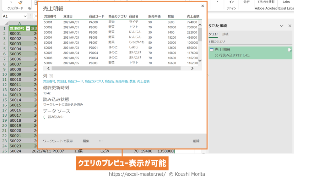 なお、「クエリと接続」ウィンドウ上の該当クエリ名にマウスカーソルを合わせている間もプレビュー表示されます。