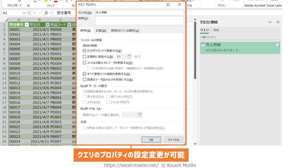 基本的にクエリは手動で適宜更新ですが、ファイルを開いた際や定期的に更新するといった設定に変更したい場合に活用すると良いでしょう。