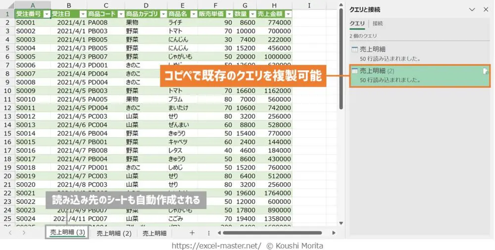 なお、読み込み先が「接続の作成のみ」以外の場合は、読み込み先のシートも自動で作成されます。