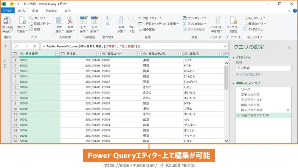 「編集」コマンドを実行すると、Power Queryエディターが再度起動します。