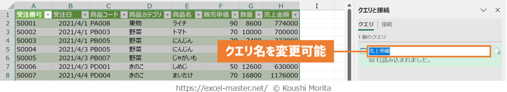 ワークシート上でクエリ名を変更できるので、Power Queryエディター上で変更するよりもお手軽です。