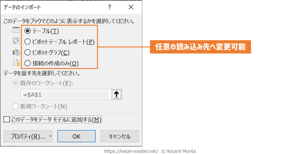 読み込み先とは、クエリの読み込み先を変更することを指します。