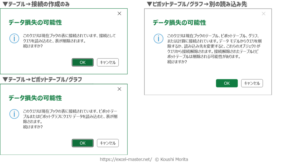 なお、変更前の読み込み先が「接続の作成のみ」以外の場合は、次のエラーメッセージが表示されます。