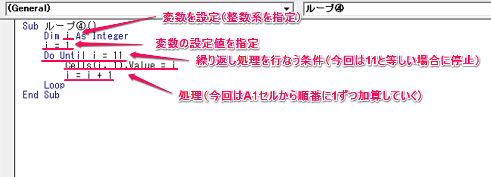 1 2 3 4 5 6 7 8 | Sub ループ③() Dim i As Integer i = 1 Do Until i < 11 Cells(i, 1).Value = i i = i + 1 Loop End Sub |