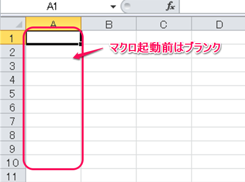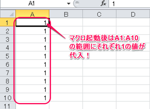 マクロを起動すると、A1~10セルにはそれぞれ1の値が代入されます。