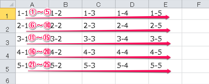 A1セルの値を”1-1″とし、A1セルを起点に値の左の数字は行、右の数字は列が増えるに従い、それぞれ1ずつ加算されていき、最終的には”5-5″になるようにします。
