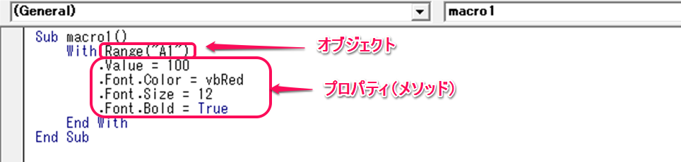 オブジェクト名の「Range(“A1”)」が1回だけの表示で、インデントも変えているためにコードも見やすいですね。