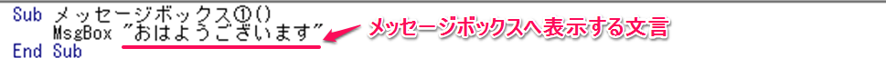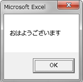 1 2 3 | Sub メッセージボックス①() MsgBox "おはようございます" End Sub |