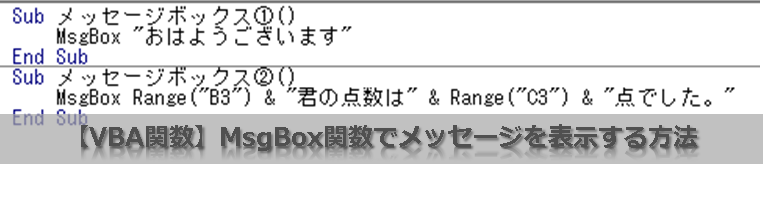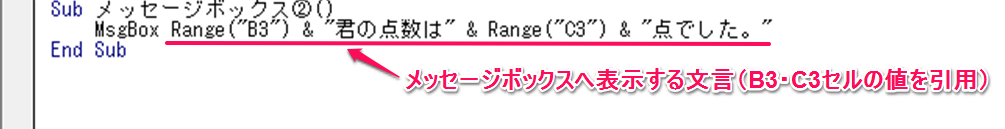 1 2 3 | Sub メッセージボックス②() MsgBox Range("B3") & "君の点数は" & Range("C3") & "点でした。" End Sub |